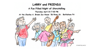 Join Larry and Friends for a fun-filled night of storytelling on Thursday, April 23, 7pm to 9pm, at the Ice House, 56 River Street, Bethlehem, PA, and featuring, from left to right, Larry Sceurman with Charles Kiernan, Denise McCormack, Geoff Fleming, Dave Howell, Ingrid Bohn, Nancy Scott, and Karen Maurer.