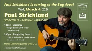 IN PERSON AND VIRTUAL Don’t miss Paul Strickland, storyteller and musician, on March 4, 2026 at the Orinda Community Center in the San Francisco Bay Area. Paul has been a featured teller at the National Storytelling Festival, an Off-Broadway Performer, and has won “Best of Show” in 18 Fringe Festivals across the country. There is a virtual option for the concert recording.