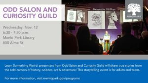 Another free event in the 10th Annual Menlo Park Storytelling Festival: Learn something weird! Our presenters explore true stories from the odd corners of history, science, art & adventure. For adults and teens.
