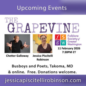 Join The Grapevine Storytelling Series on Wednesday, February 11 at 7:30 Eastern at Busboys and Poets Takoma; or, for out-of-towners, via Zoom. Our featured tellers this month are Jessica Piscitelli Robinson and Chetter Galloway!
