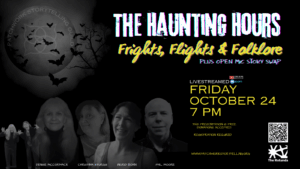 After the curated tales, the virtual stage opens for an open mic swap, giving storytellers from across the nation a chance to share their own legends, myths, and ghostly lore.