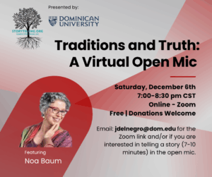 Email: for the Zoom link and/or if you are interested in telling a story (7-10 minutes) in the open mic.